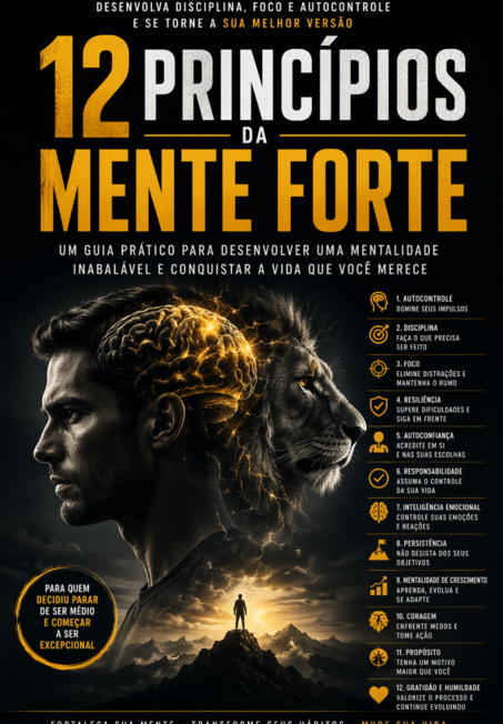 “12 Princípios da Mente Forte” é um guia prático e direto para desenvolver disciplina, autocontrole e uma mentalidade inabalável em um mundo cheio de distrações, pressão social e fraquezas emocionais.