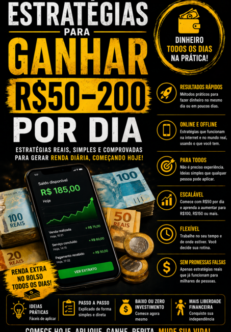 Estratégias Para Ganhar R$50–200 Por Dia” é um guia prático, direto e sem enrolação para quem quer começar a gerar renda todos os dias — mesmo partindo do zero.