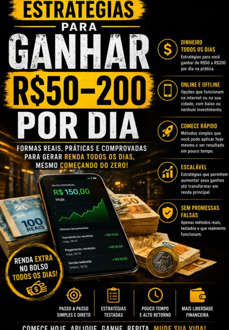 “Estratégias Para Ganhar R$50–200 Por Dia” é um guia direto ao ponto para quem precisa gerar renda de forma rápida, prática e consistente — mesmo começando do zero.