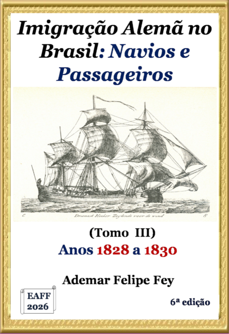 O presente trabalho apresenta os navios de imigrantes e seus passageiros que imigraram para o Brasil a partir da Alemanha nos anos de 1828 a 1830, considerado o primeiro período oficial da imigração alemã para o Brasil. Embora nestes anos a maioria dos imigrantes foram trazidos para os atuais estados do Rio Grande do Sul, Paraná, São Paulo e de Santa Catarina, sempre que possível, são citados passageiros que foram destinados para outros estados. Além dos dados dos navios envolvidos, sempre que disponíveis, são citados os passageiros transportados, com um resumo genealógico dos mesmos. Dezesseis veleiros transatlânticos são abordados, trazendo as listas de passageiros mais completas possíveis, no presente momento. O livro apresenta mais de cento e trinta referências bibliográficas que podem ser utilizadas pelo leitor no aprofundamento do estudo.